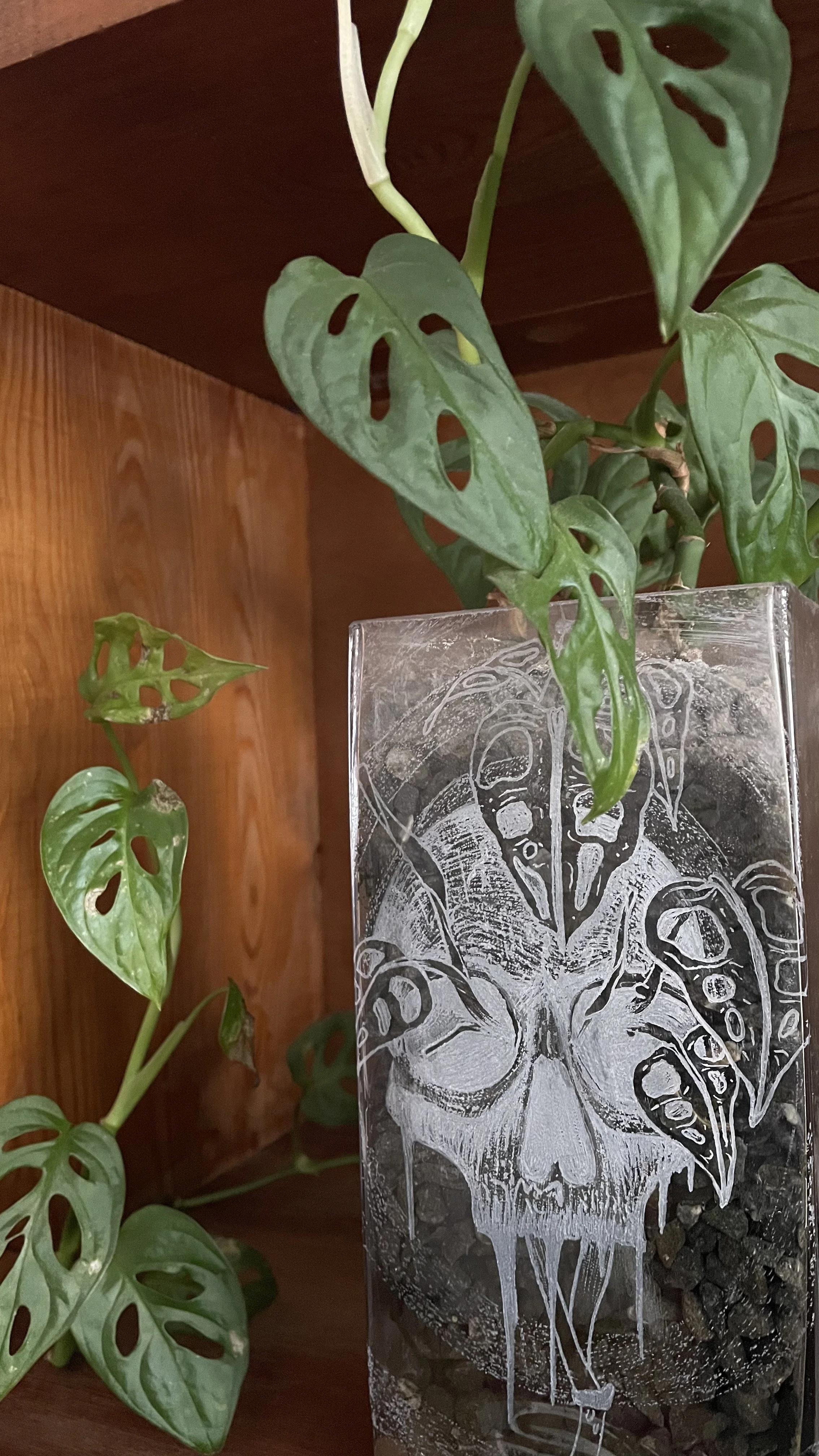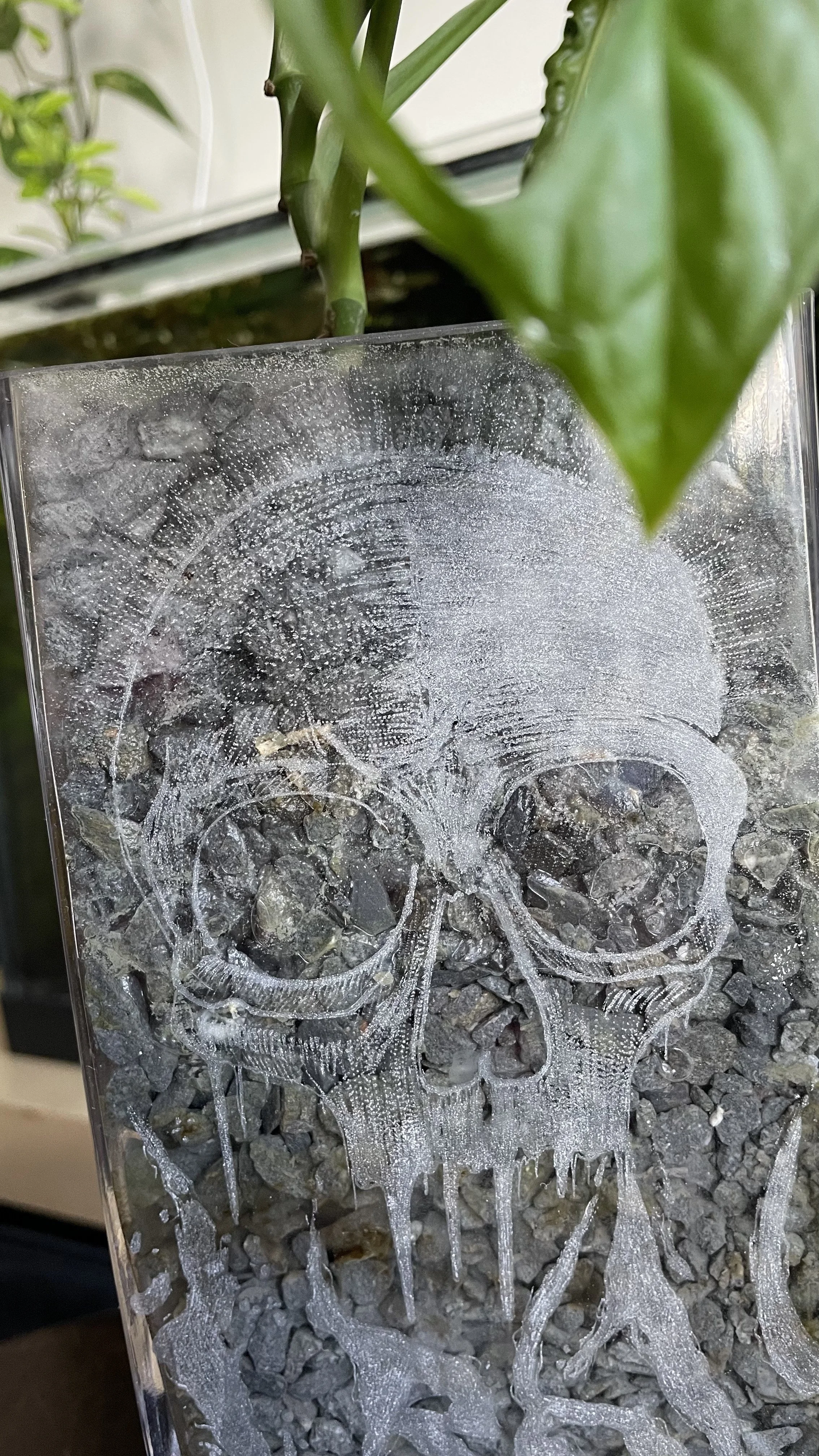 Description: A delicate dialogue between the cold clarity of glass and the warm pulse of life. Fine engravings of mortality embrace the vibrant green of living plants, showing that beauty can grow even through the most fragile vessels. It is a tribute to the cycles of growth, decay, and the light that connects them both.